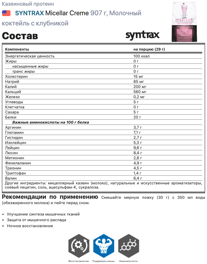 Протеин казеиновый SYNTRAX Micellar Creme, Клубничный милкшейк, 907 г 4 099 ₽ Подробнее