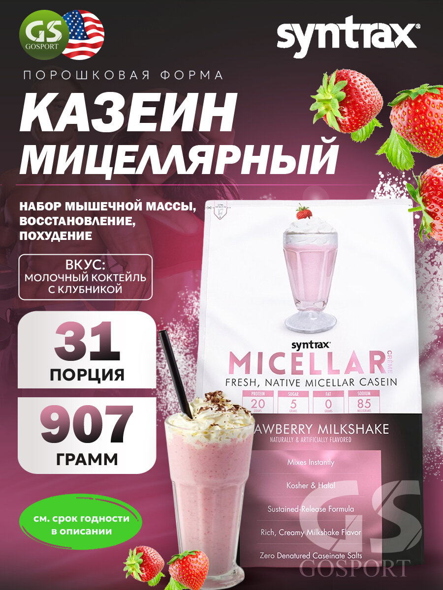 Казеиновый протеин SYNTRAX Micellar Creme 907 г, Молочный коктейль с клубникой