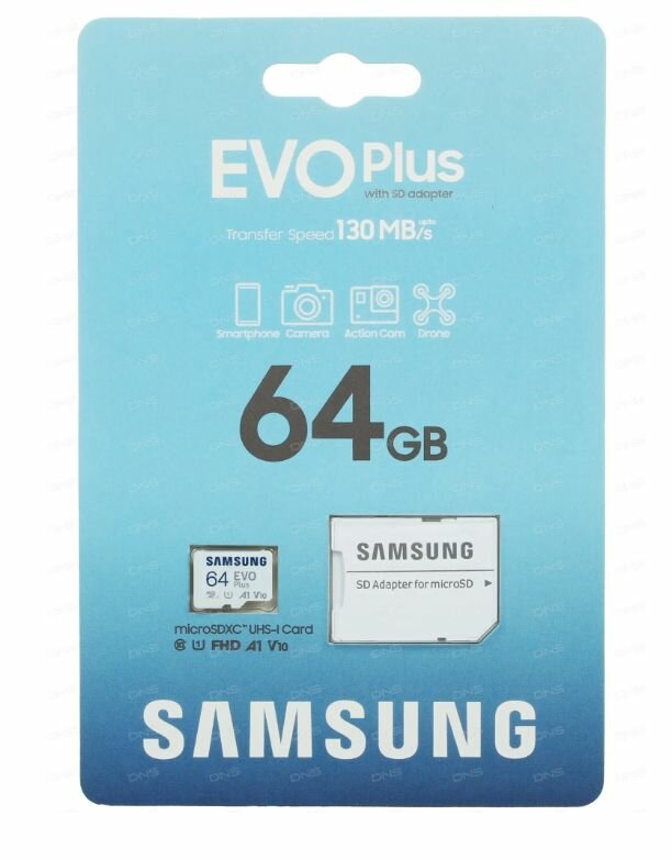 Карта памяти Samsung EVO Plus microSDXC 64 ГБ Class 10, V10, A1, UHS-I U1, R 130 МБ/с, адаптер на SD