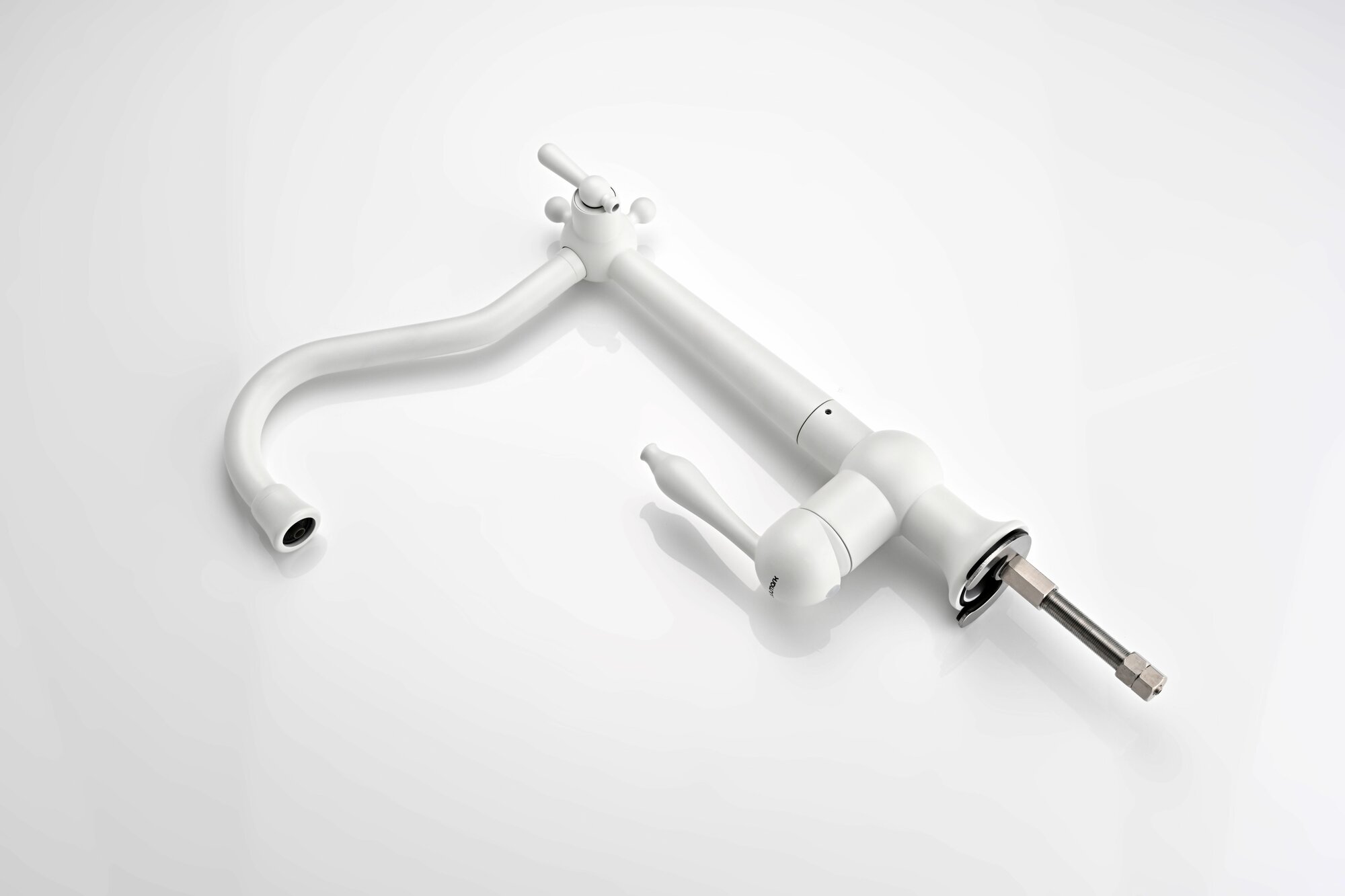 Смеситель для кухни с подключением к фильтру питьевой воды Paulmark RETRO, высокий поворотный излив ретро дизайна из латуни, двурычажный, для мойки / столешницы, белый матовый, Re213226-431