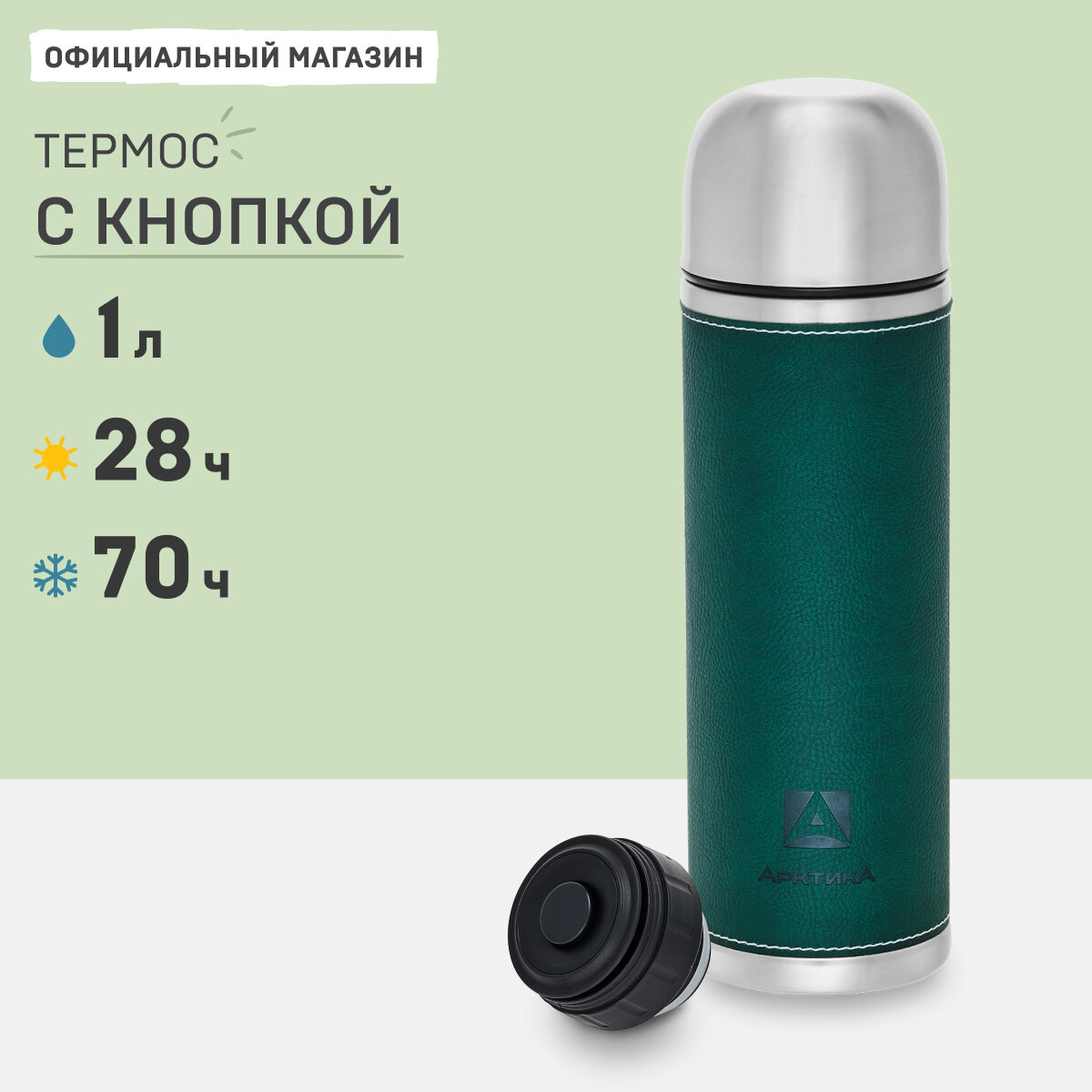 Термос Термос для чая и кофе Арктика 108-1000 зеленый 1 литр в кожаной оплетке с кнопкой и чашкой