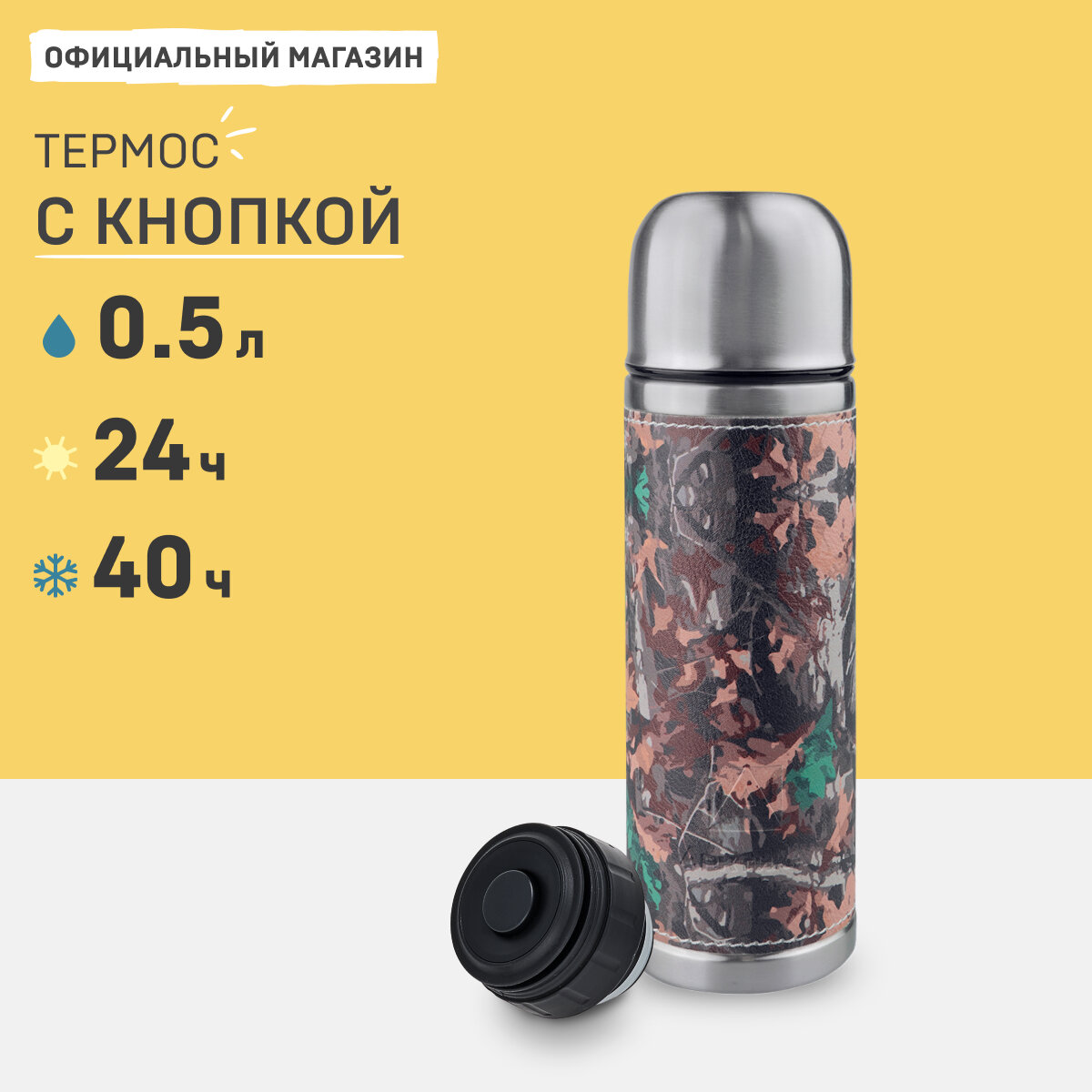 Термос для напитков 0,5 л. с кожаной вставкой на корпусе Арктика 108-500 пробка с кнопкой