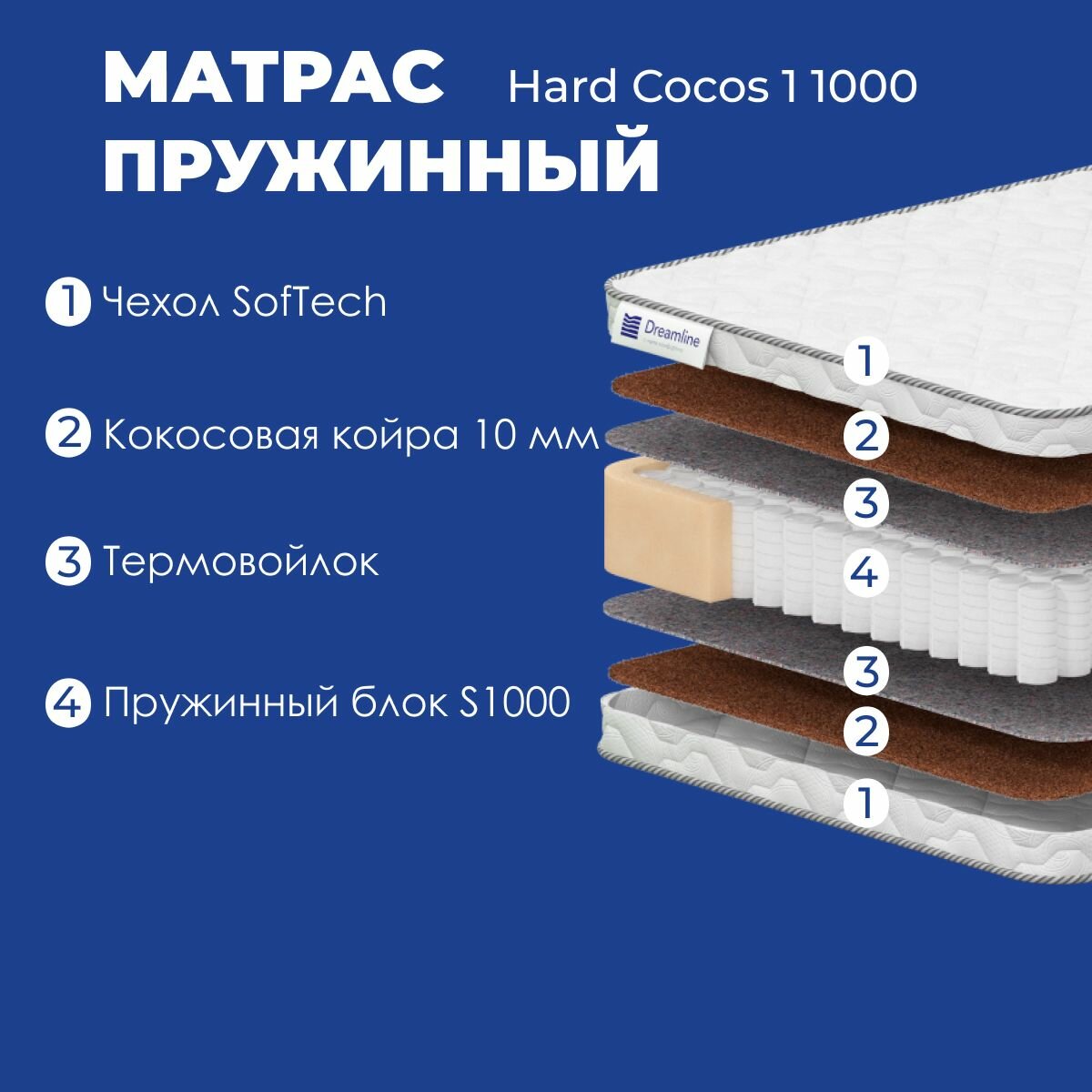 Матрас Dreamline Hard Cocos 1 1000, 150x190, высота 17 см, независимые пружины
