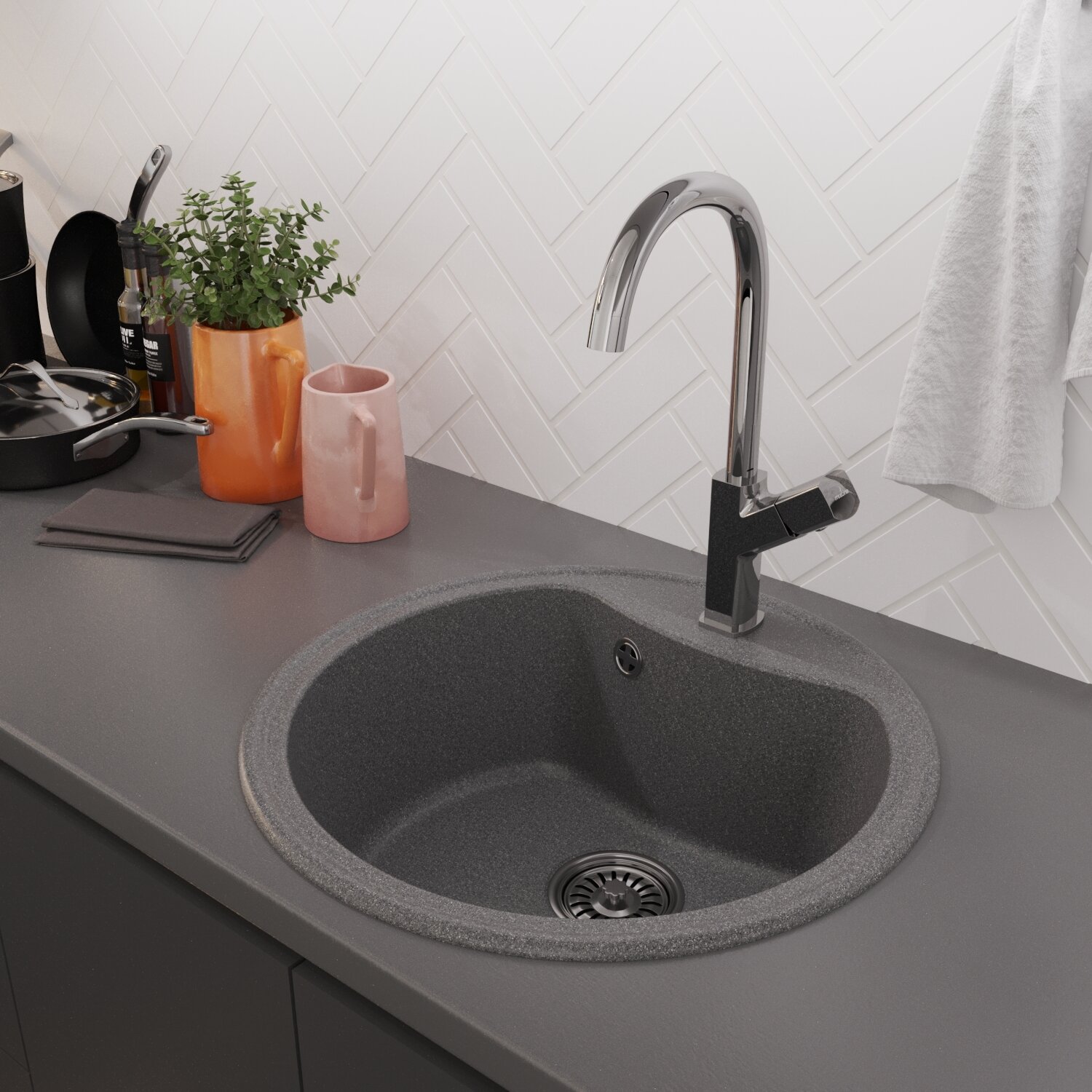 Мойка для кухни из искусственного мрамора круглая MIXLINE ML-GM 09, с сифоном, антрацит