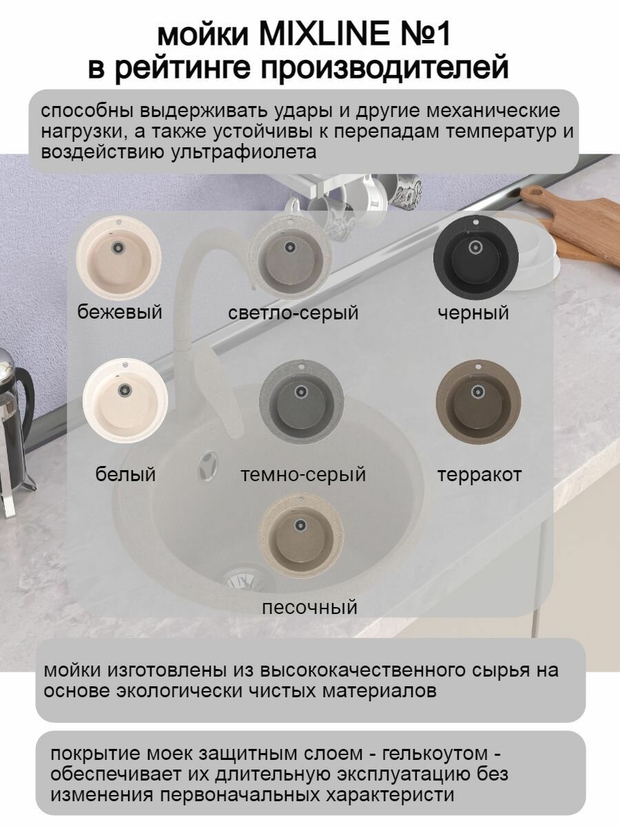 Мойка для кухни из искусственного мрамора круглая MIXLINE ML-GM 10 с сифоном, песочная 6 915 ₽ Подробнее