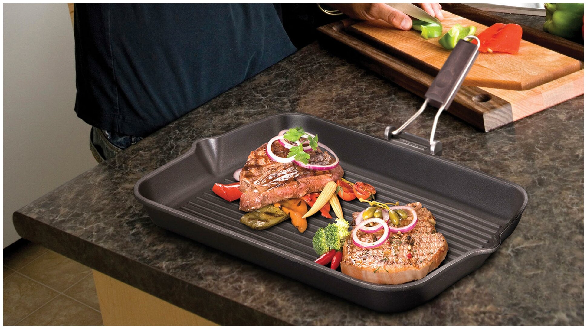 | Функции и возможности | рифленое дно / сливной желоб / складная ручка / мытье в посудомойке / использование в духовке |