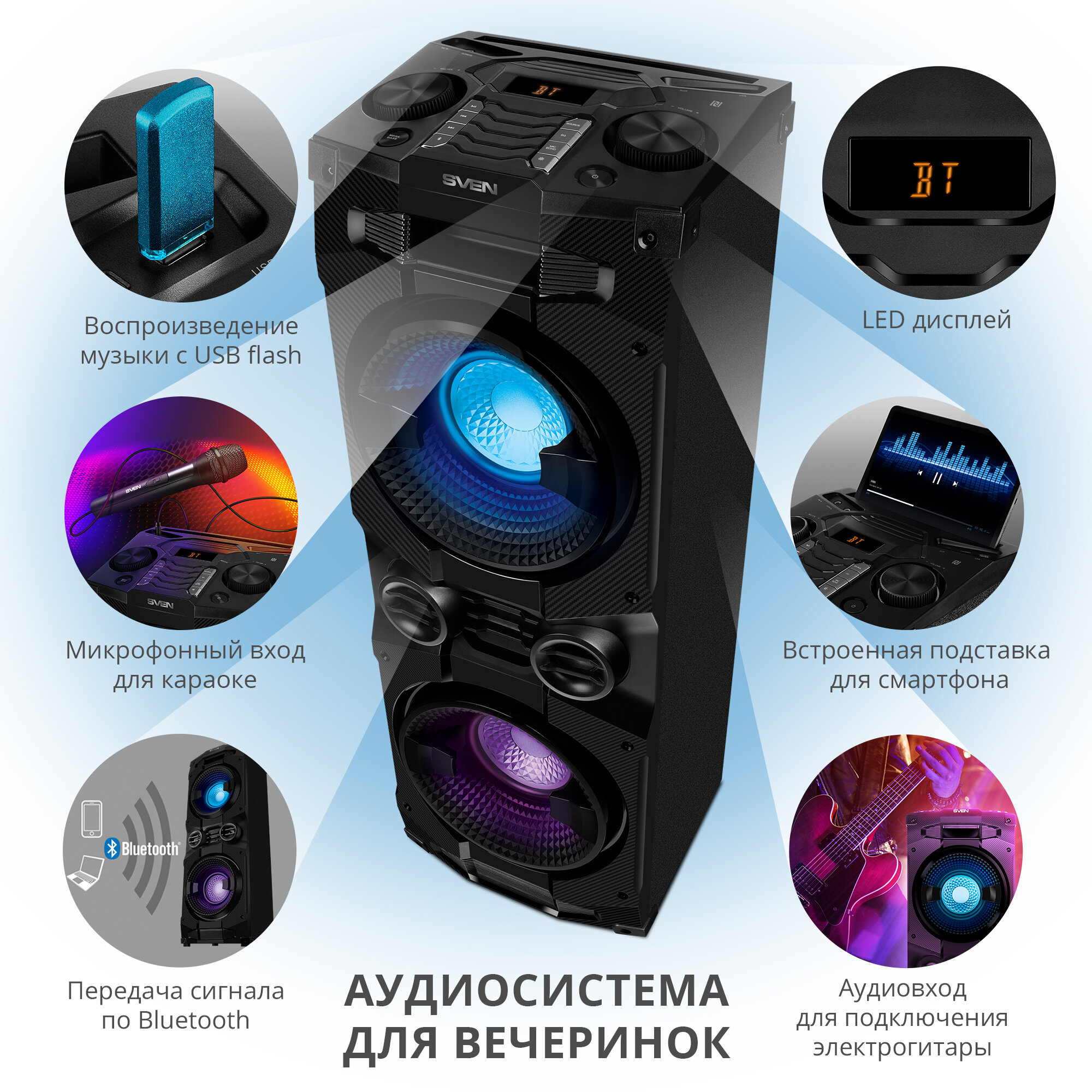 Аудиосистемы Большая Bluetooth колонка SVEN PS-1500 / Аудиосистема для вечеринок с разъемами для караоке и электрогитары (питание 220В, FM-радио, USB, LED-дисплей), 500 Вт