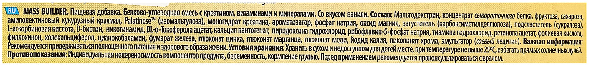 Лучшие цены. Гейнер VPLAB Mass Builder - продукт для тех, кто тренируется на пределе возможностей и наращивает мышечную массу. Состав подобран так, чтобы привести вас к максимальным результатам. Превосходная двухкомпонентная протеиновая матрица с добавлением глютамина и BCAA способствует восстановлению и росту мышц. Многоступенчатый карбо-комплекс, включающий сложные углеводы и пребиотики - оптимальное решение для снабжения энергией и наилучшего усвоения. Магазины в вашем городе.