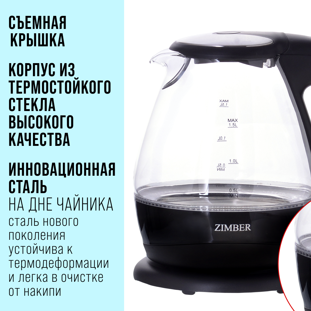 Электрочайник Чайник электрический ZIMBER, 1,5 л, стеклянный с подсветкой 11183