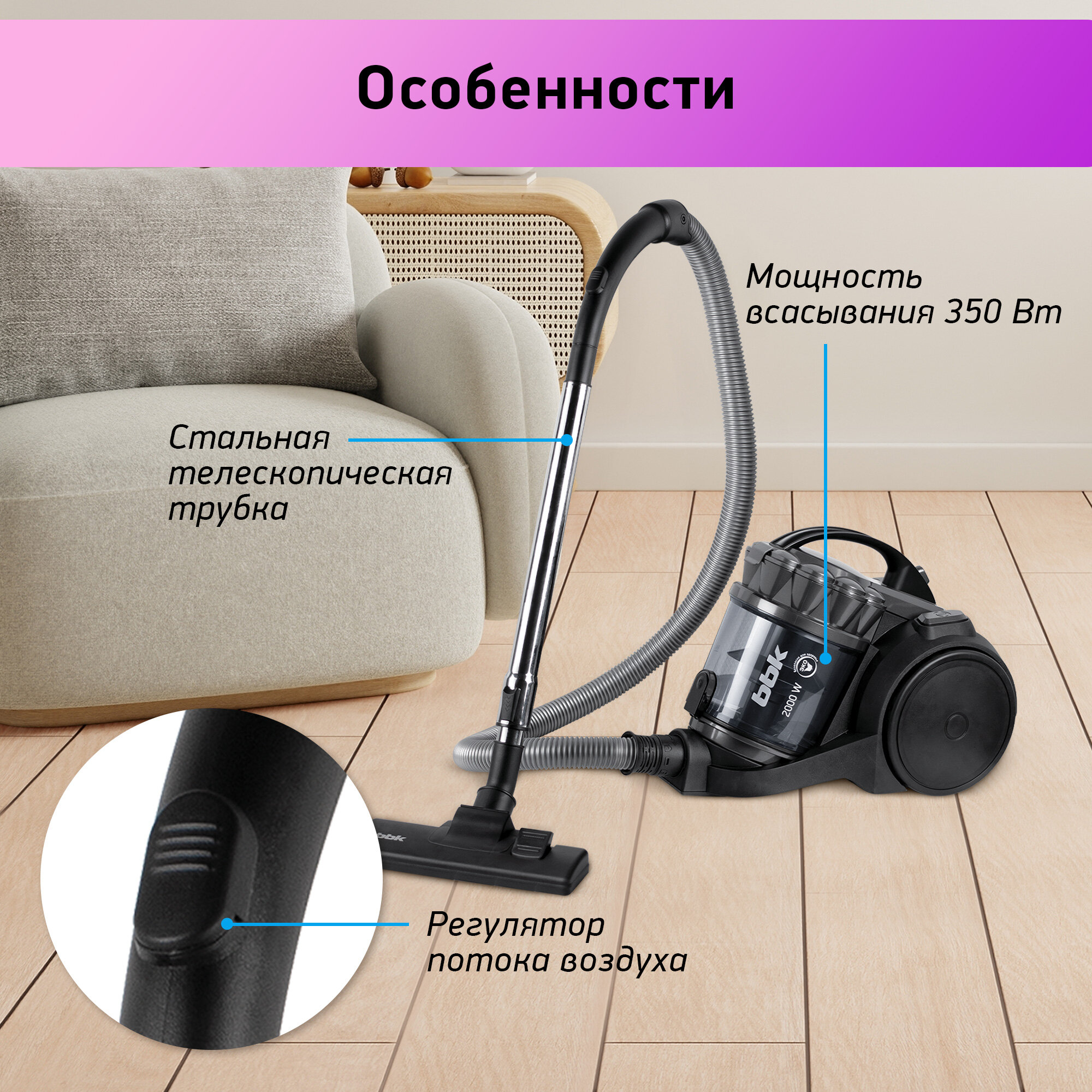 Пылесосы Пылесос циклонный BBK BV1505 темно-серый, мощность 2000 Вт, нера фильтр, мощность всасывания 350 Вт, объем пылесборника 2 л, 3 насадки в комплекте