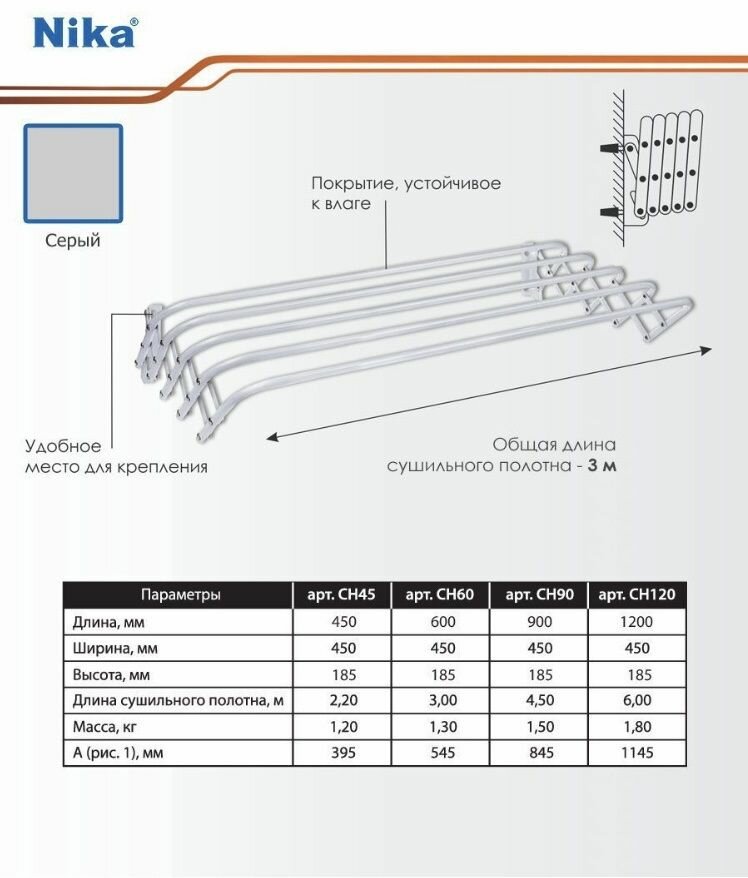 Сушилка для белья NIKA СН60 3м настенная складная металлическая серый цвет 899 ₽ Подробнее