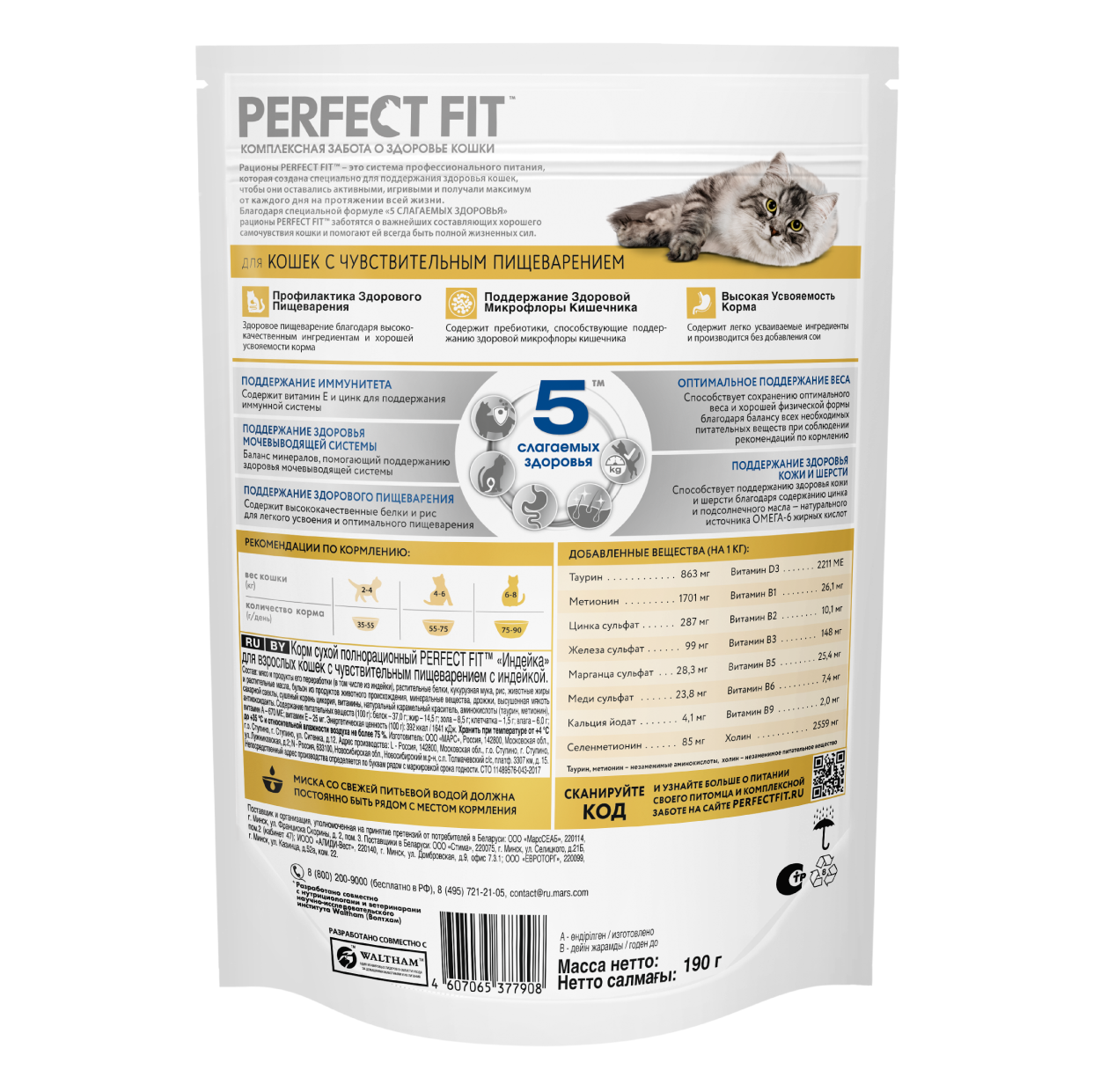 Сухой корм PERFECT FIT для кошек с чувствительным пищеварением с индейкой 190г 10188796/10172968