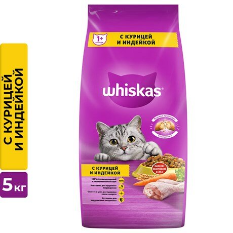 Корм для кошек Сухой корм Whiskas для кошек, курица/индейка, подушечки, 5 кг