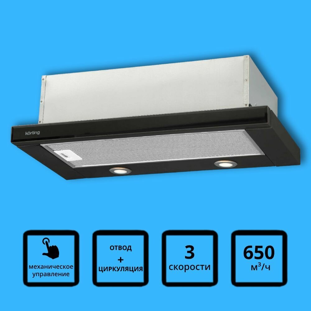 Встраиваемые вытяжки Korting/ Встраиваемая вытяжка в выдвижным экраном в ретро дизайне,ширина 60 см, 3 режима, механическое управление, 650 м3/ч., алюминиевые жировые фильтры, LED освещениe - 2 лампы, ур.шума 57дб, рейлинг в цвете бронза, цвет - черный