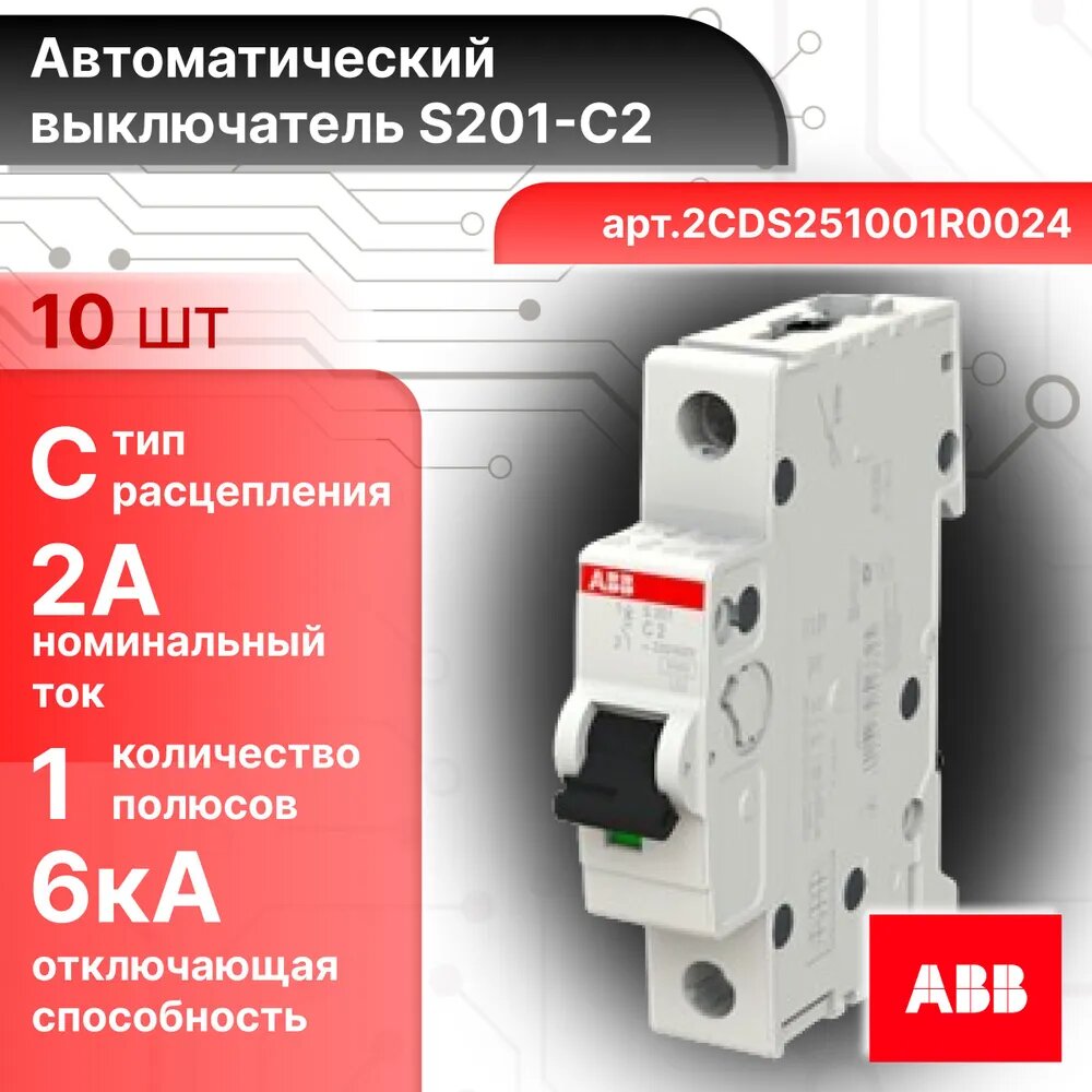 Выключатели Автоматический выключатель 1п (1P) 2А тип C 6кА S201 ABB 2CDS251001R0024 10шт