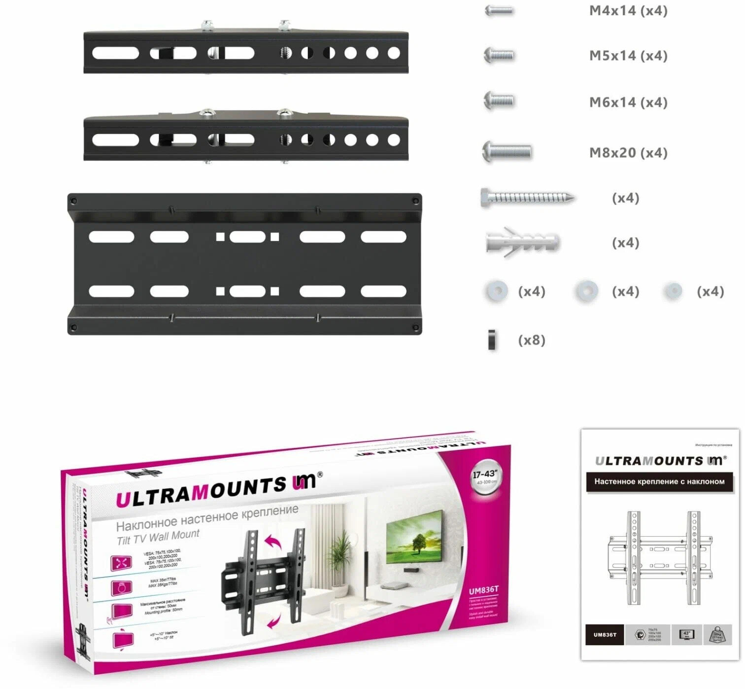 Кронштейн Ultramounts UM 836T, для ТВ, наклонный, 17-43", до 35 кг, 50 мм от ст, черный