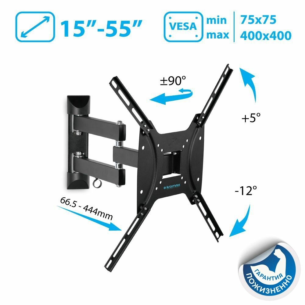 Подставка/крепление Кронштейн для телевизора Kromax DIX-24, 15-55", настенный, поворотно-выдвижной и наклонный, черный (28014)