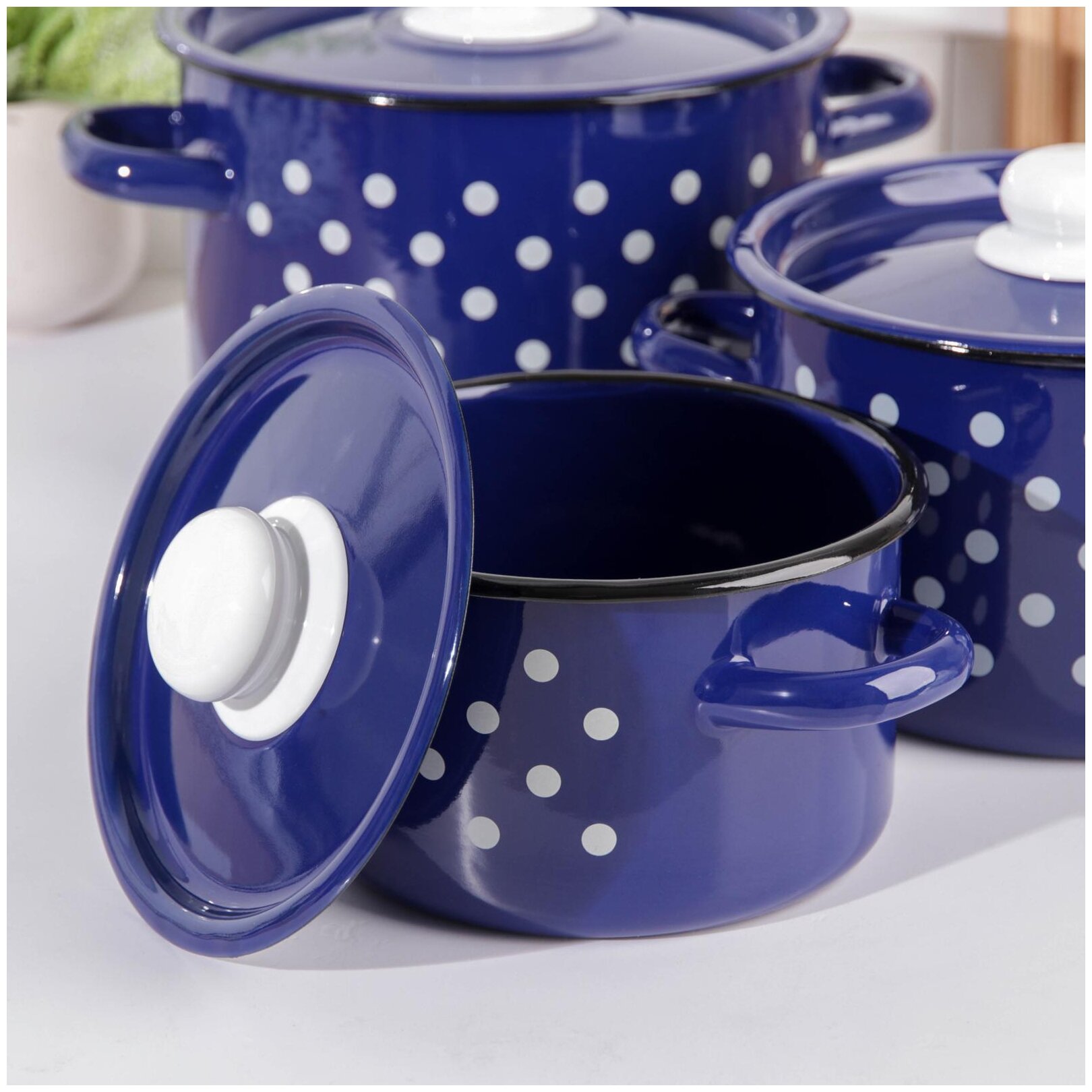 Набор эмалированных кастрюль Белый горох на синем (1,5л+2,9л+4,5л) Череповец.