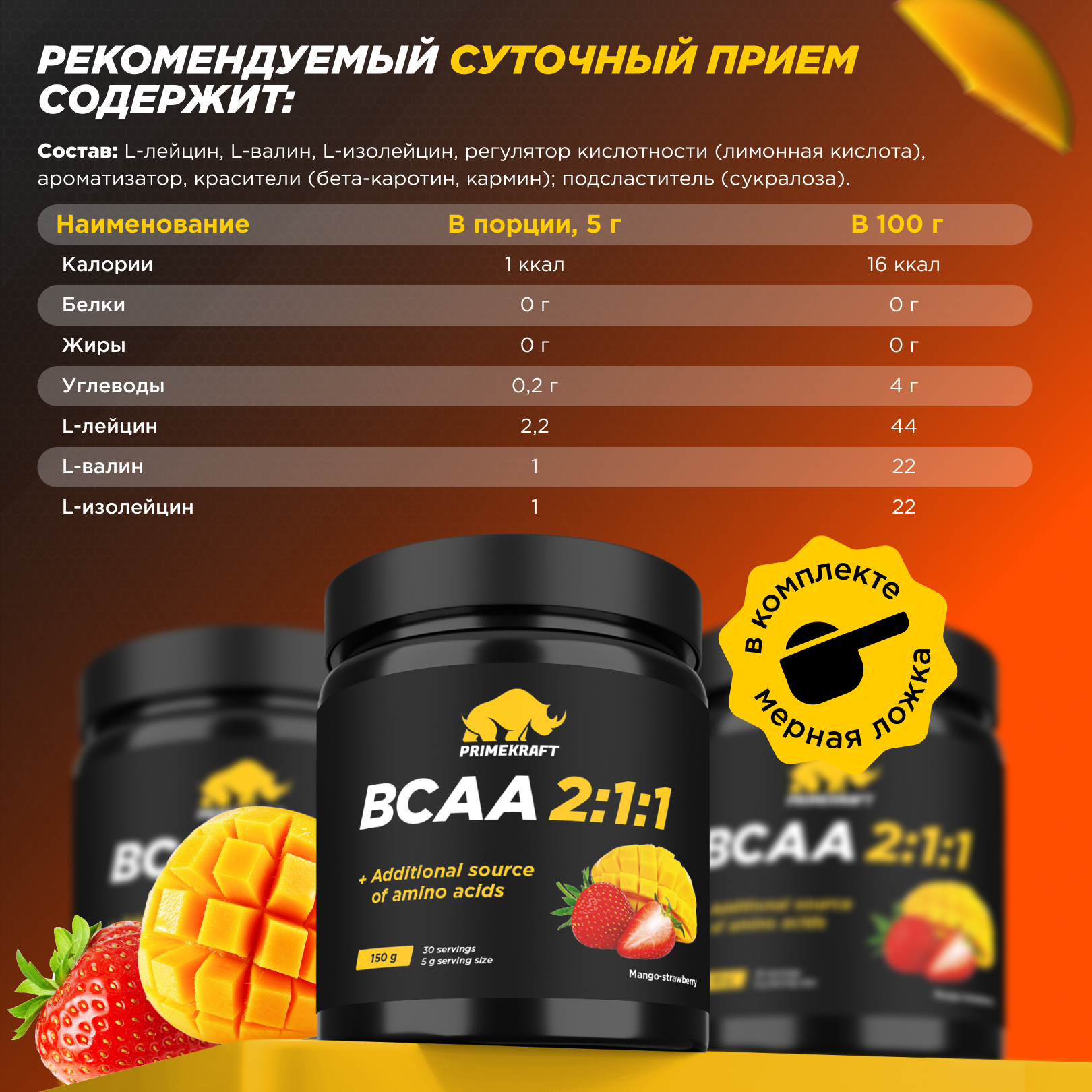 Аминокислоты Аминокислоты PRIMEKRAFT BCAA 2:1:1 (БЦАА) Манго-клубника, 150 г / 30 servings