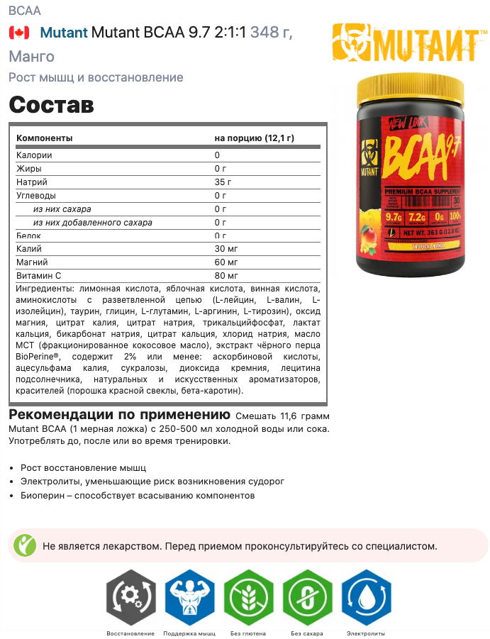 Mutant Незаменимые аминокислоты ВСАА 9.7 с электролитами, порошок 30 порций, 348 гр, Тропическое манго 1 579 ₽ Подробнее