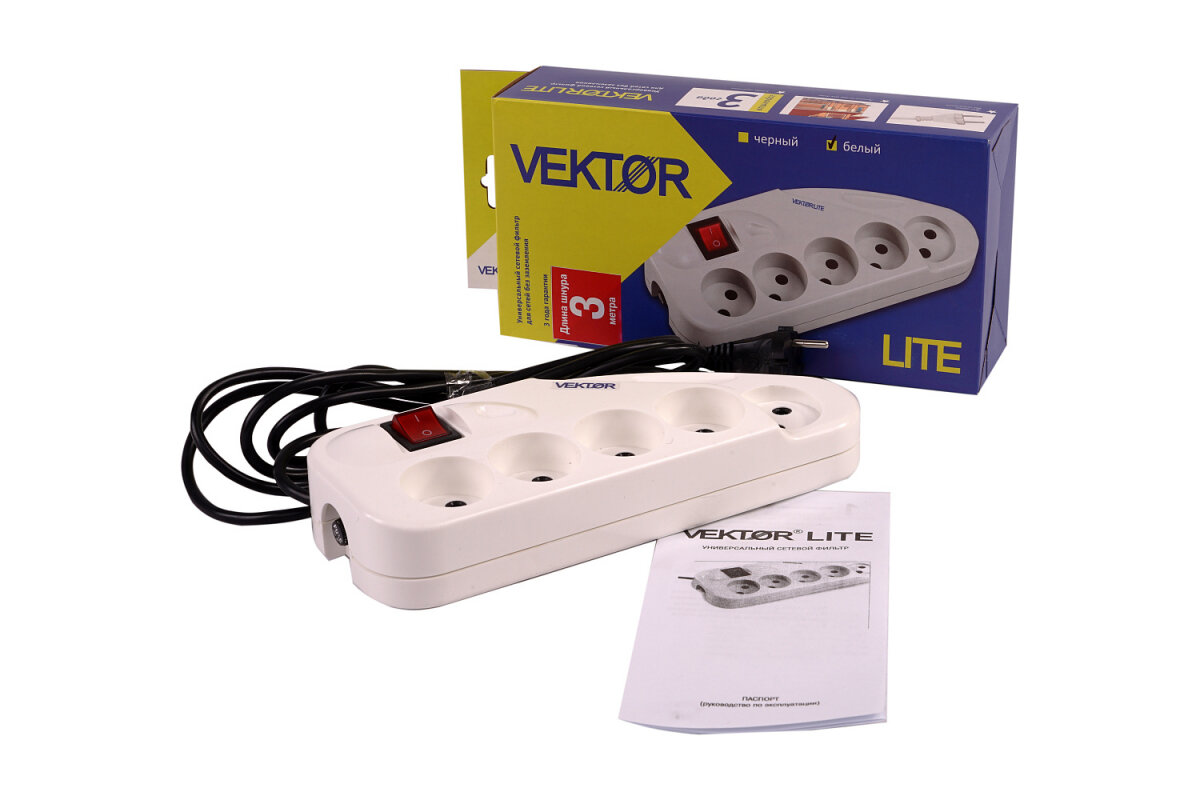 Сетевой фильтр VEKTOR Lite, 5 розеток, 3 м, б/з, 10А белый