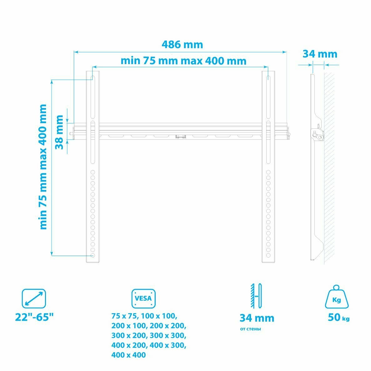 Кронштейн Kromax VEGA-11, для ТВ, фиксированный, 22-65", до 50 кг, 34 мм от стены, черный