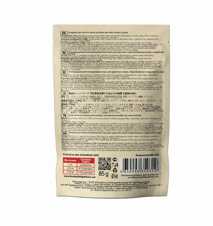 Корм для кошек Корм для кошек стерилизованных влажный BROOKSFIELD (Бруксфилд) Sterilized/Light (пауч) 12 шт - 85 г, Индейка в соусе