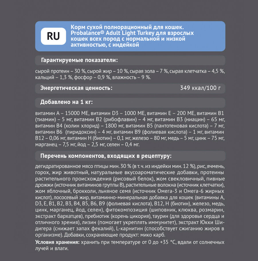 Сухой корм для кошек ProBalance Adult Light с индейкой, 10 кг 3 700 ₽ Подробнее
