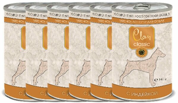 Корм для собак CLAN CLASSIC мясное ассорти для взрослых собак с индейкой банка NEW 340 гр х 6 шт
