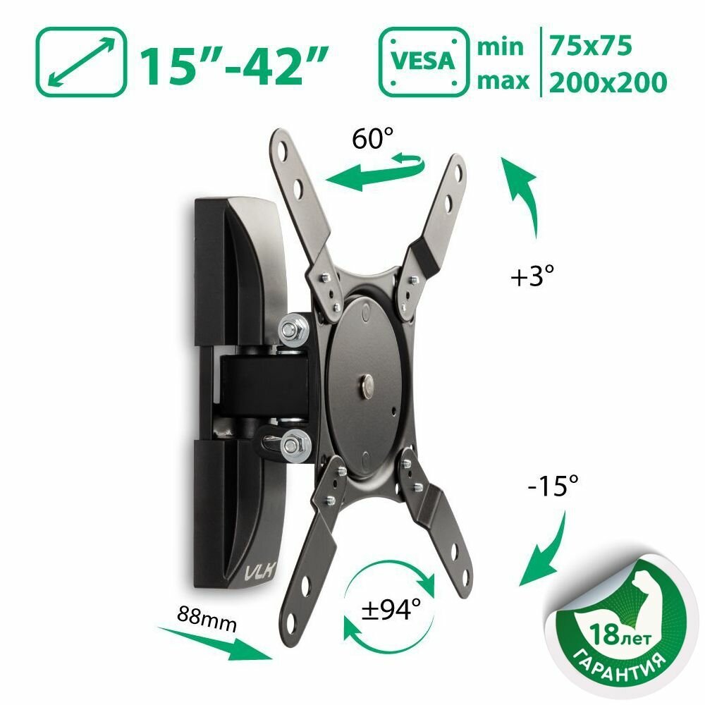 Кронштейны для техники VLK Кронштейн настенный VLK TRENTO-103 15-42" (наклон +5°/-15°, поворот 90°, до 15 кг, черный)