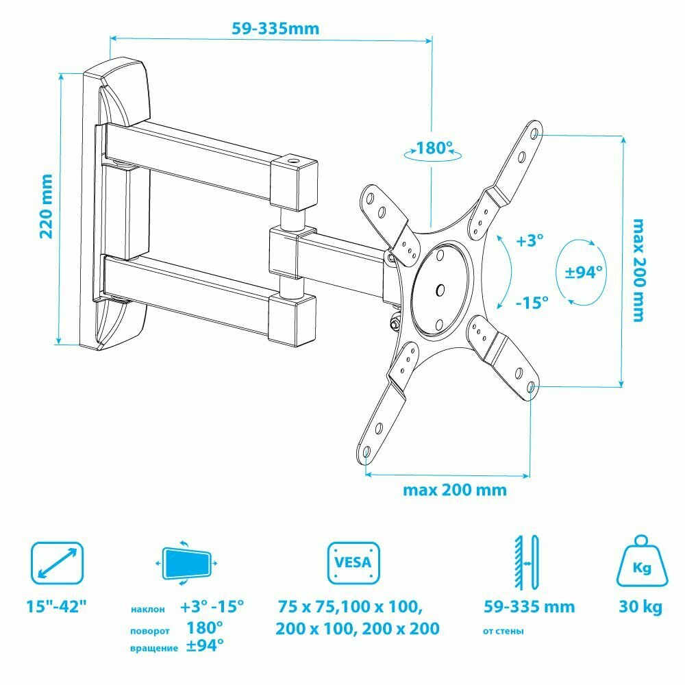 Кронштейн TRENTO-103, для ТВ, наклонно-поворотный, 15-42", 79 мм от стены, черный 1 370 ₽ Подробнее