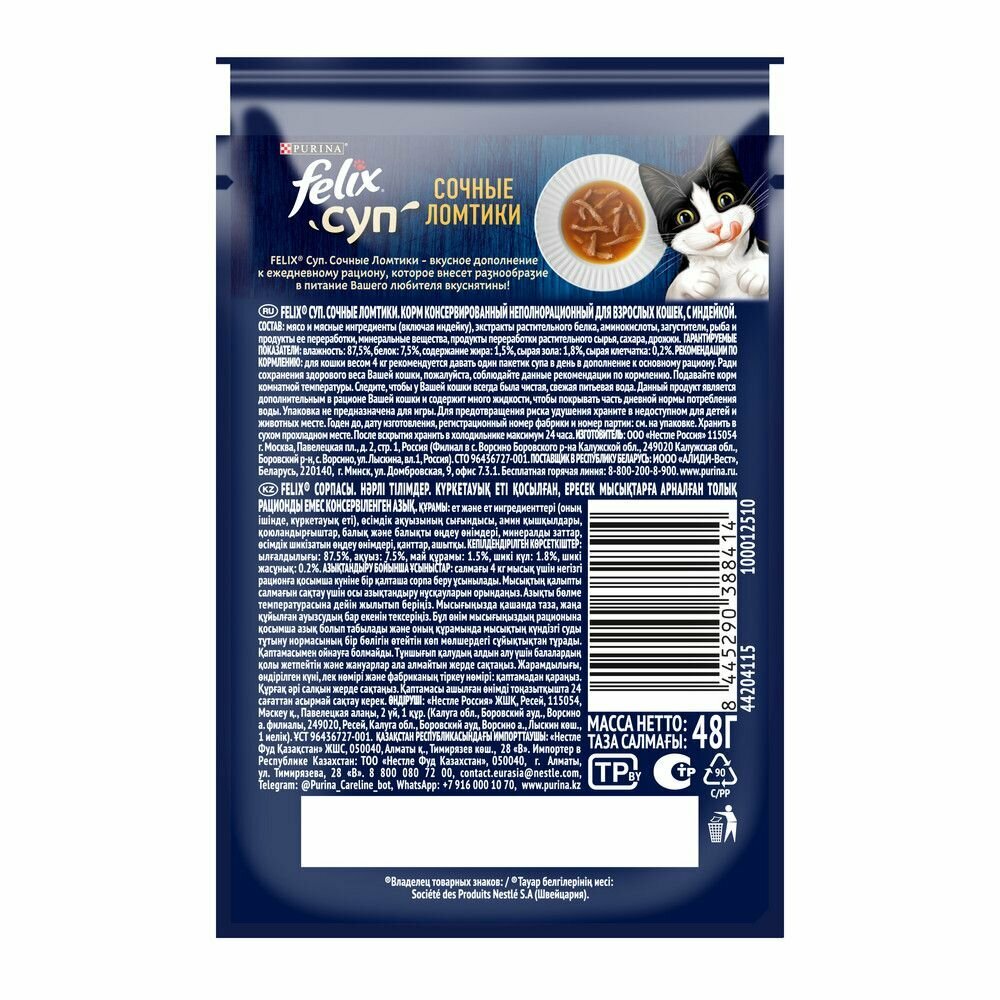 Корм для кошек Felix суп Сочные ломтики 48 г пауч влажный корм для взрослых кошек, с индейкой 36 штук
