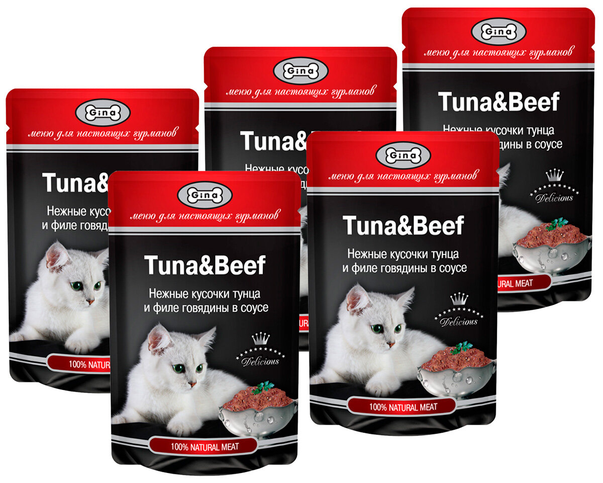 Корм для кошек GINA для взрослых кошек с тунцом и говядиной в соусе 85 гр пауч NEW 85 гр х 5 шт