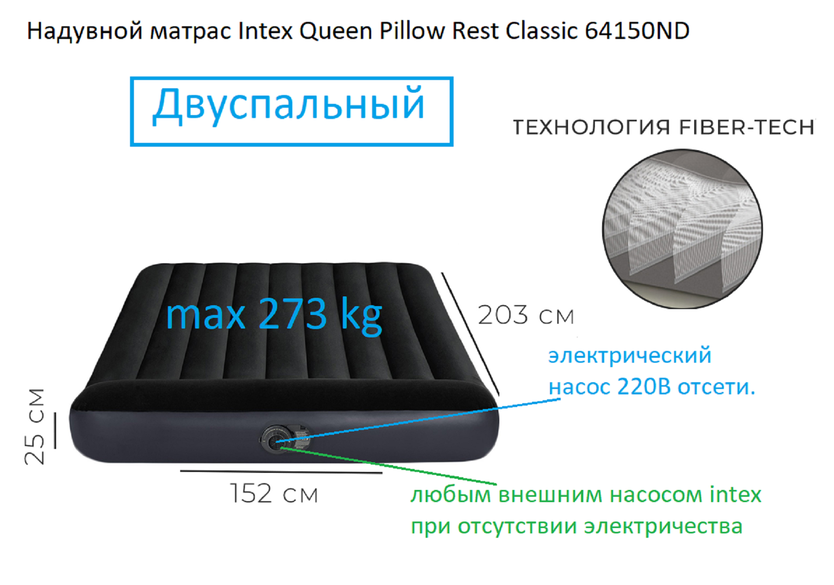 Надувной матрас Intex (Интекс) Pillow Rest Raised Bed Fiber-Tech 64150 (с насосом 200Вт)
