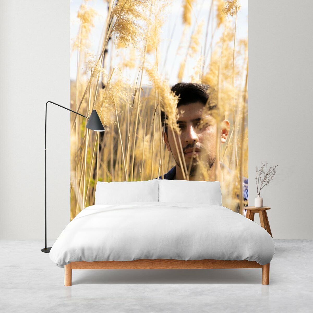 Санки Фотообои "Красота природы, мальчик, тростник обыкновенный" 200x270 см. флизелиновыена стену