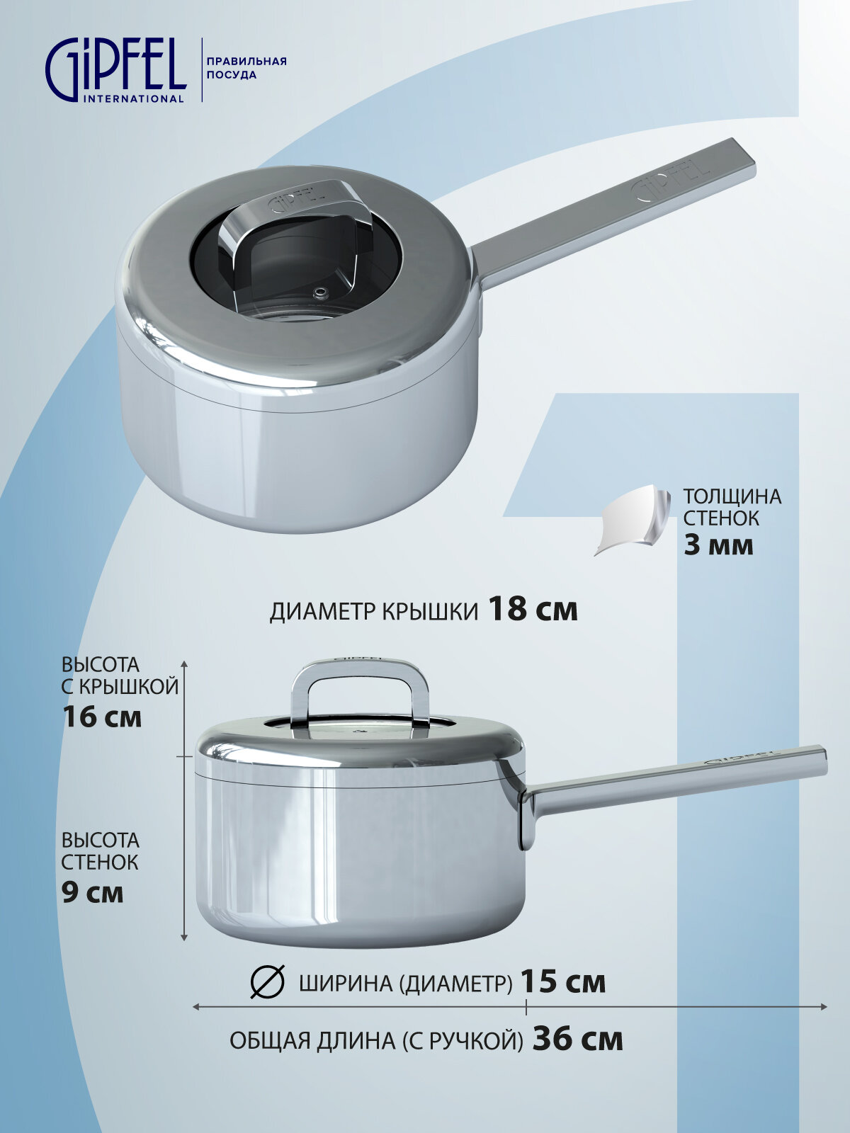 Кастрюля Ковш из нержавеющей стали Gipfel Aventus 1399 18 см/2 л стальной