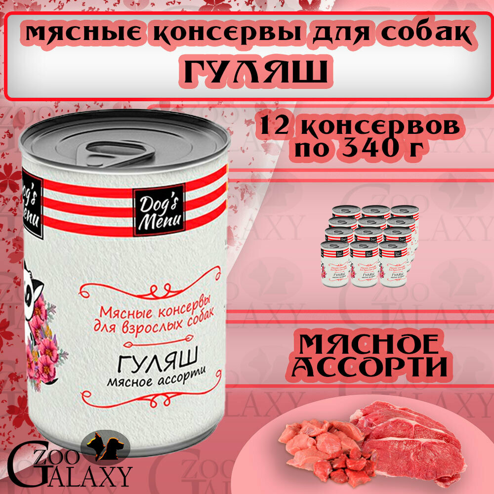 Dog`s Menu влажный корм для взрослых собак гуляш мясное ассорти в консервах - 340 г х 12 шт