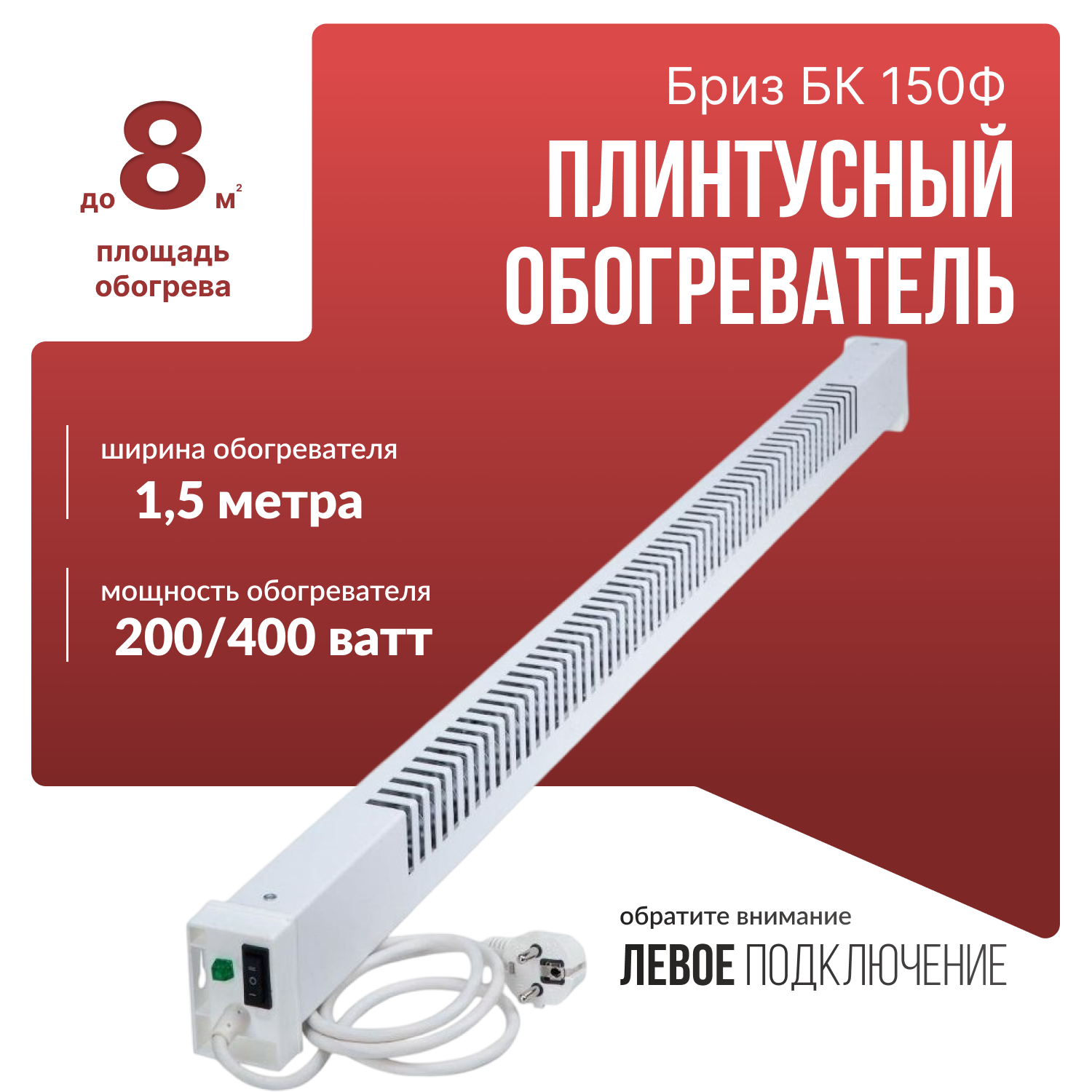 Плинтусный обогреватель Бриз Фиксированный БК150Ф Белый, Левый