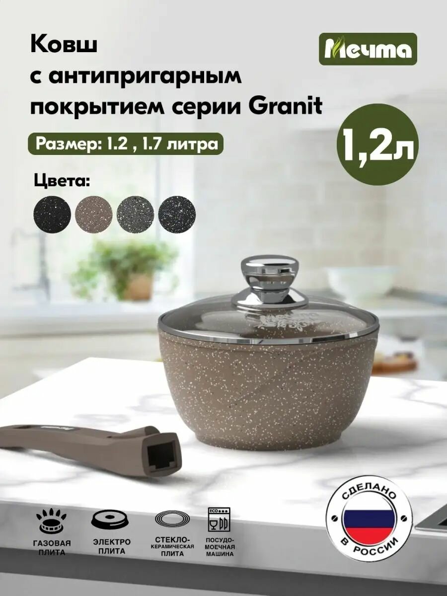 Кастрюля Ковш Мечта 1.2 л Гранит с антипригарным покрытием со съемной ручкой и крышкой, НЕ индукционная