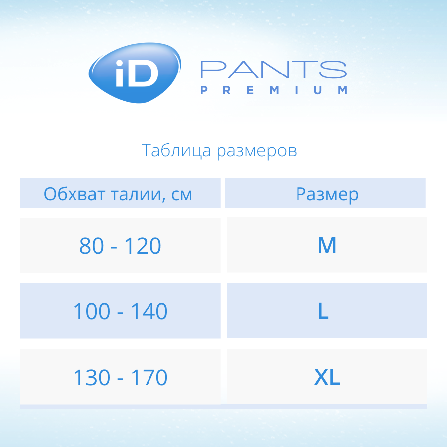 Подгузники-трусики для взрослых iD Premium L (100-140 см), 10 шт . 900 ₽ Подробнее