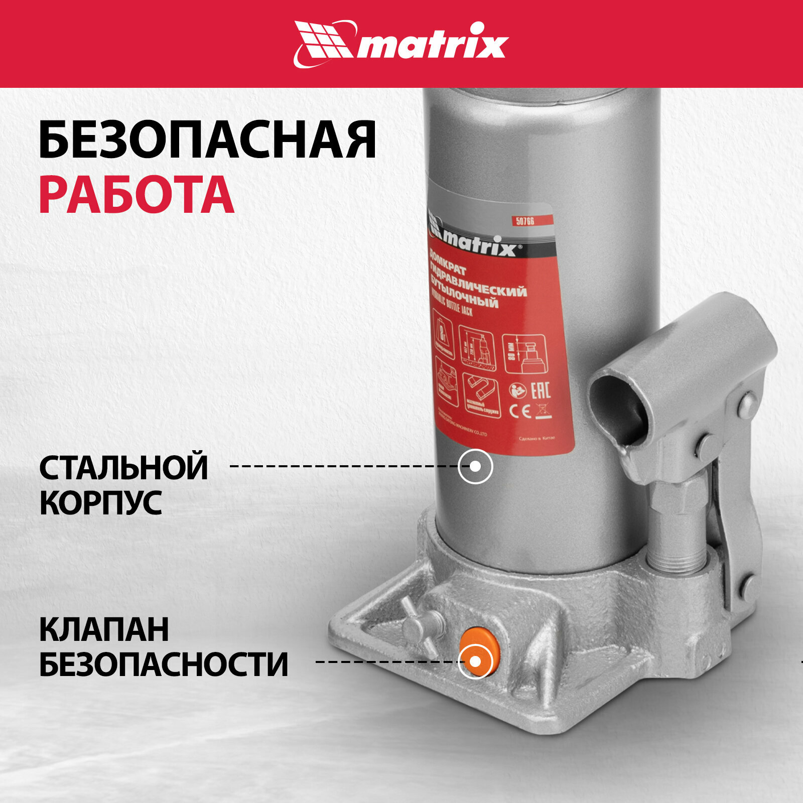 Домкрат гидравлический бутылочный Matrix 50766, 8 т, h подъема 230–457 мм