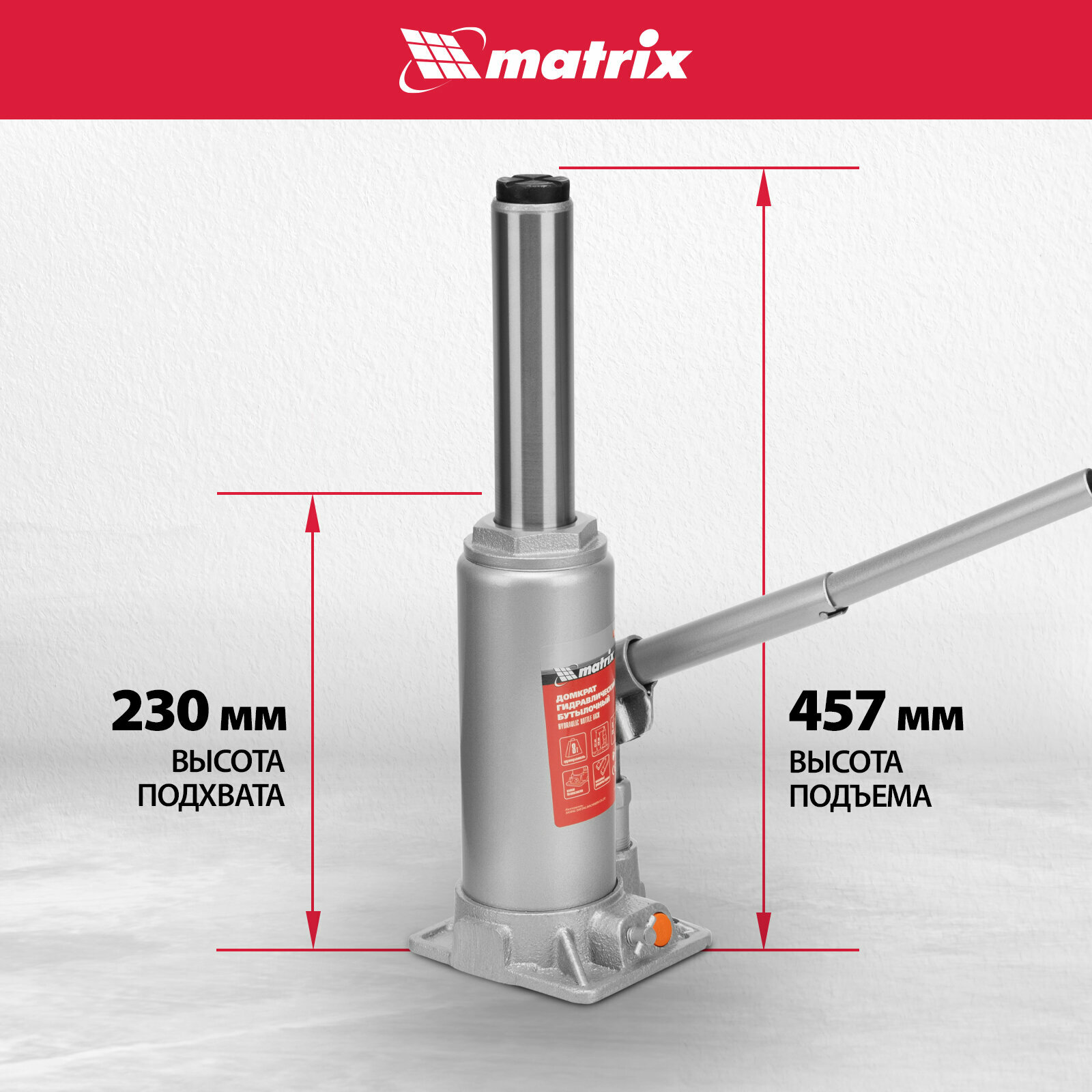 Домкрат гидравлический бутылочный MATRIX 8 т, h подъема 230–457 мм 50766