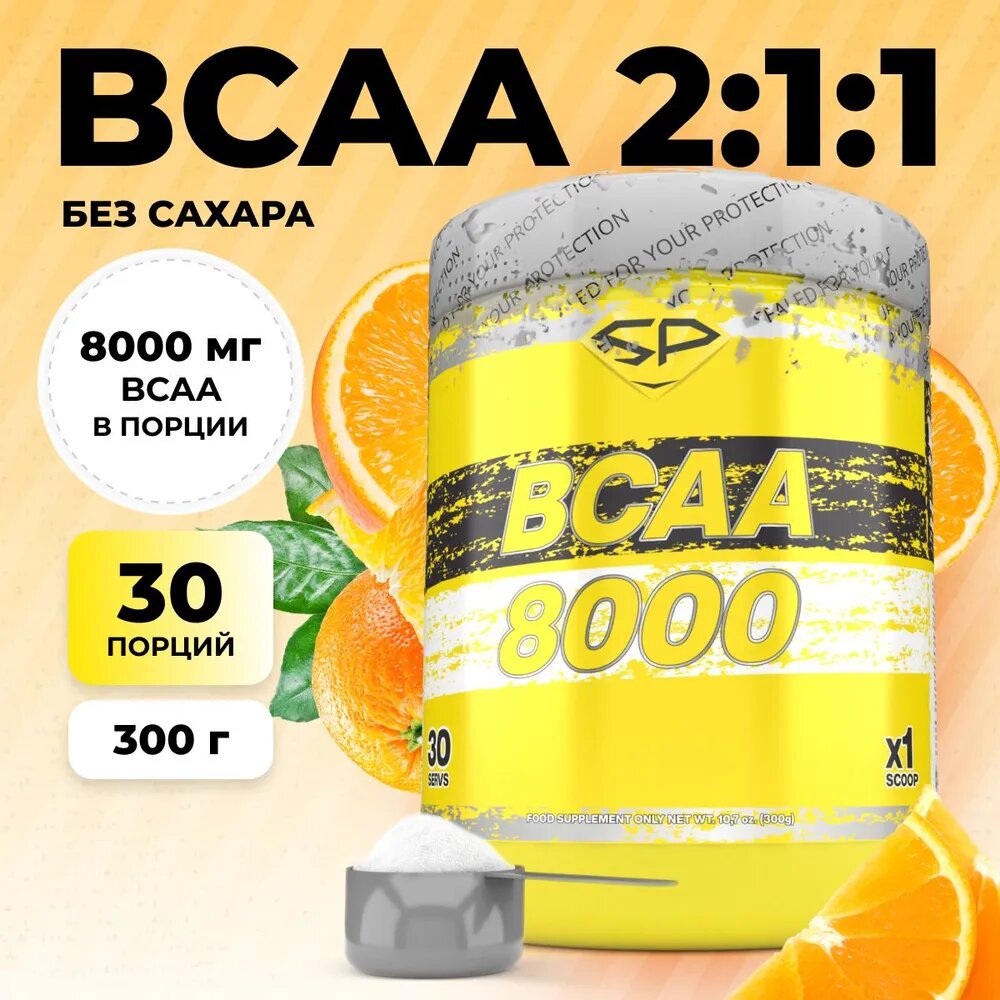 Аминокислоты STEELPOWER BCAA 8000, 300 гр, Апельсин, 30 порций / ВСАА 2:1:1 (БЦАА 2:1:1) для похудения без сахара, без углеводов