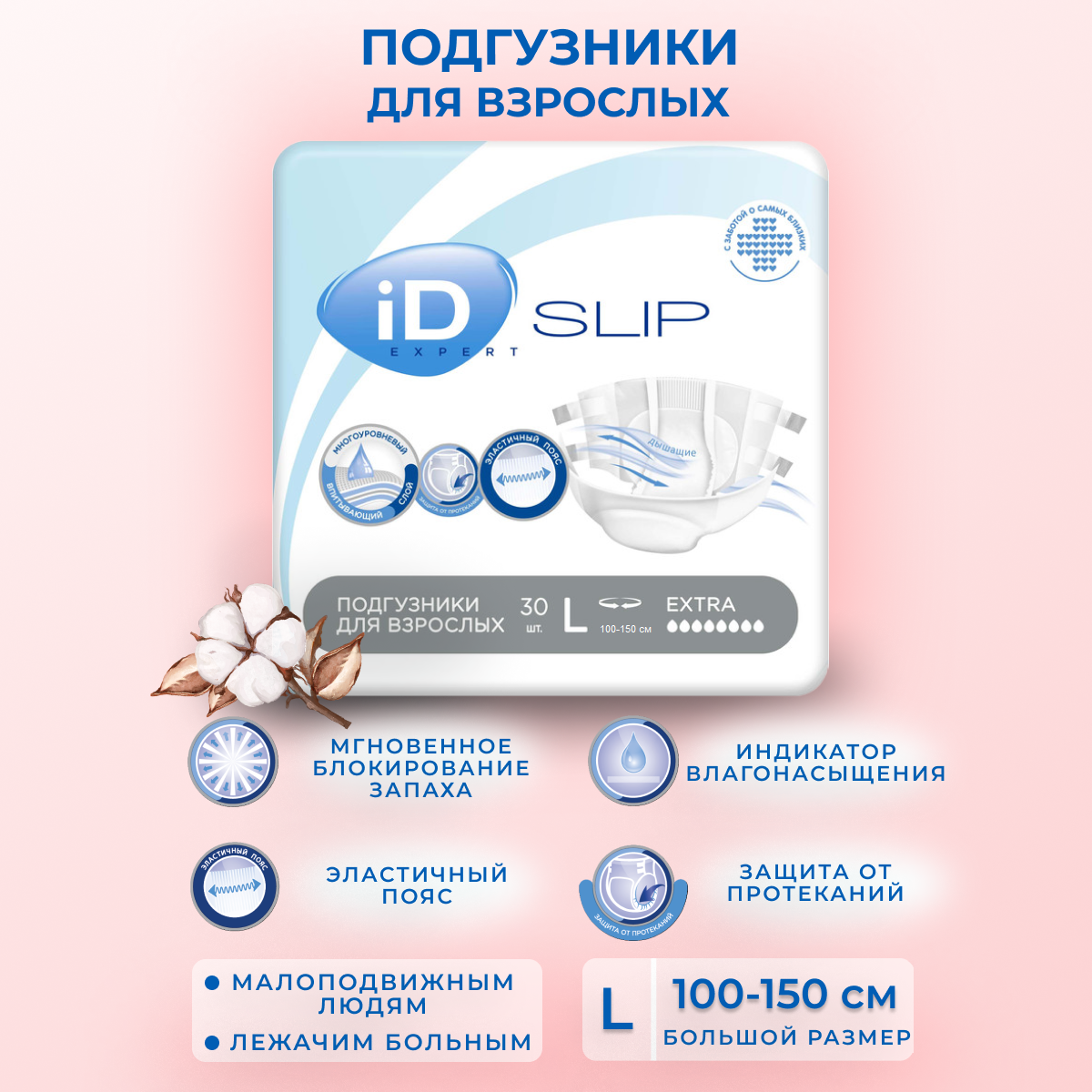 Подгузники для взрослых iD SLIP EXPERT L 30 шт, объем талии 100-150 см