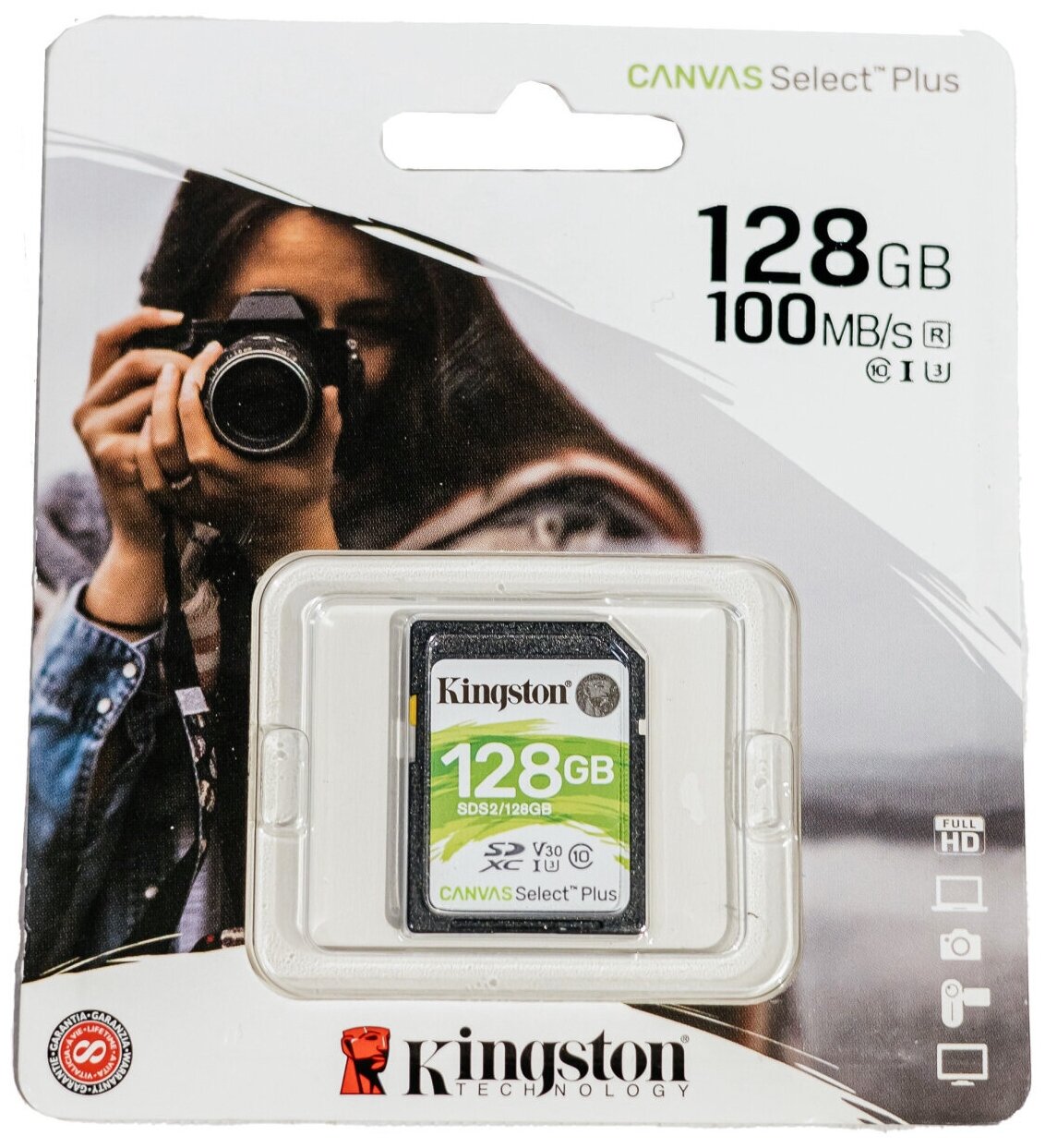 Карта памяти SDXC UHS-I U3 Kingston Canvas Select Plus 128 ГБ, 100 МБ/с, Class 10, SDS2/128GB, 1 шт., без адаптера