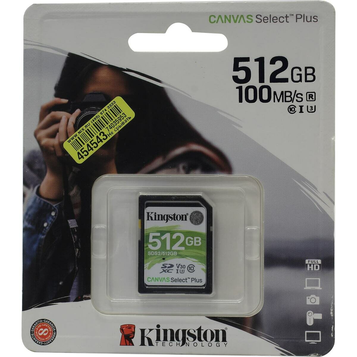Карта памяти SDXC UHS-I U3 Kingston Canvas Select Plus 512 ГБ, 100 МБ/с, Class 10, SDS2/512GB, 1 шт., без адаптера