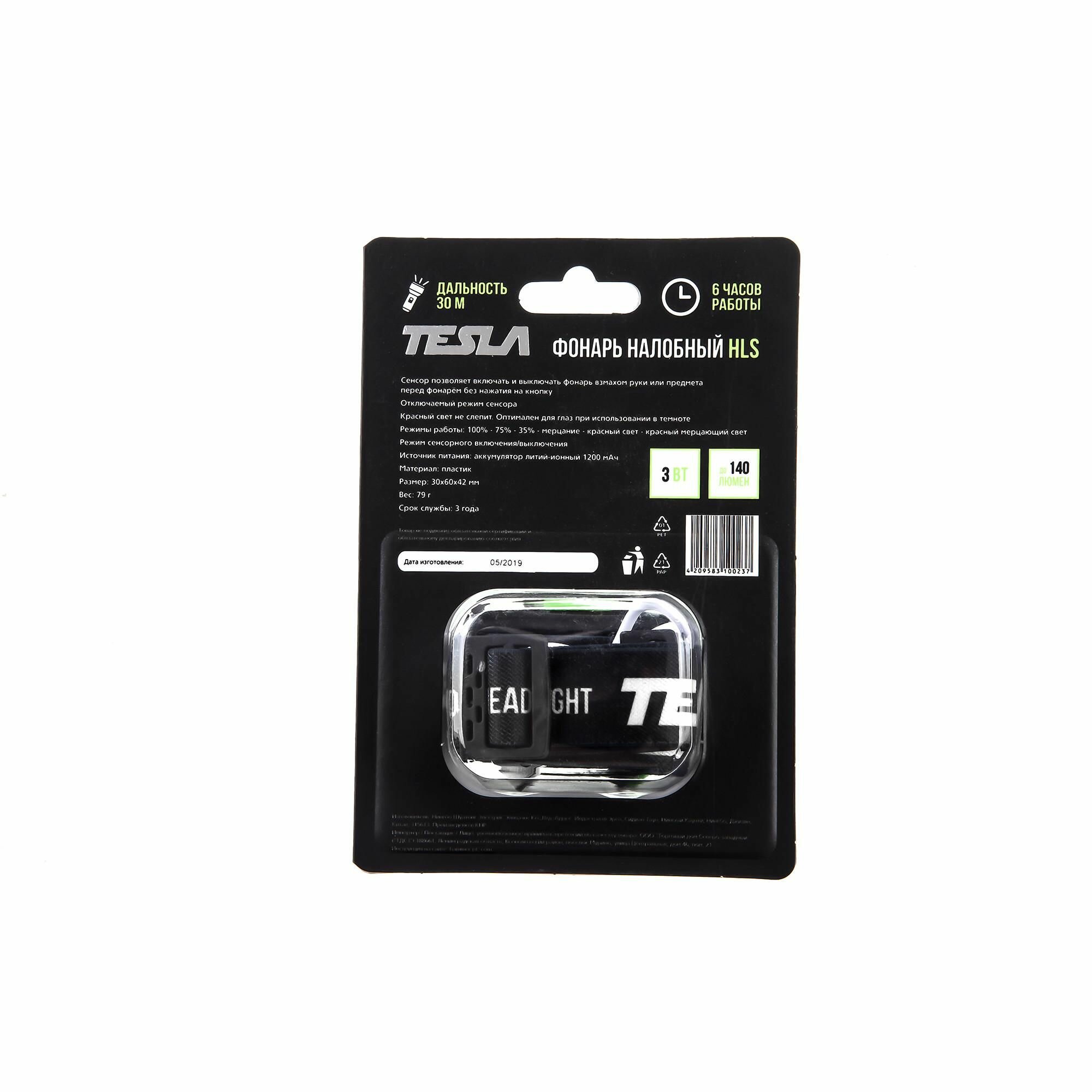 Фонарик Фонарь налобный светодиодный TESLA HLS 3Вт, 140 люмен, 6 режимов работы, сенсорный выключатель, от аккумулятора 1200мАч