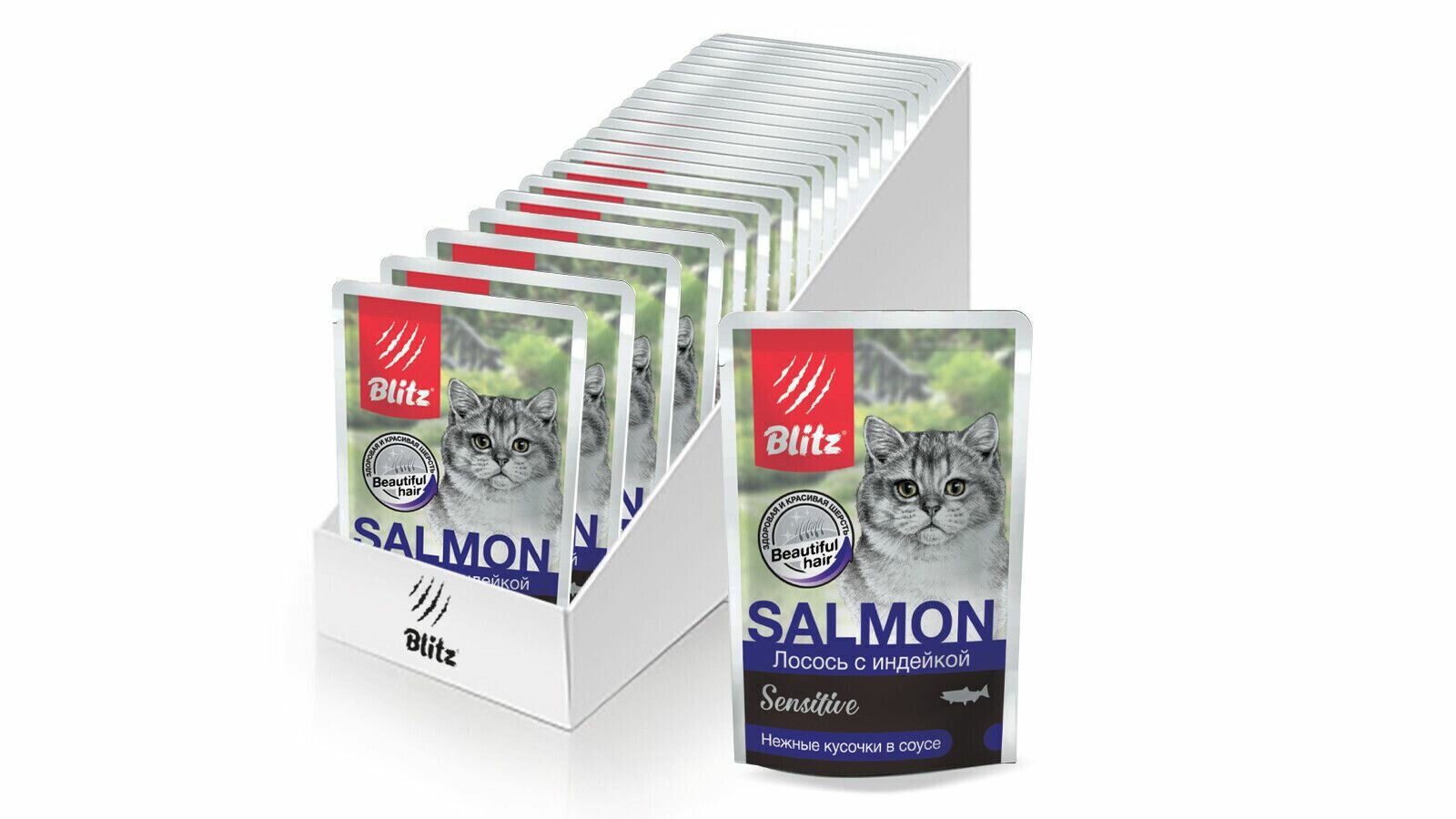 Корм для кошек Blitz Sensitive Влажный корм для взрослых кошек, лосось с индейкой, нежные кусочки в соусе 85гр х 24шт
