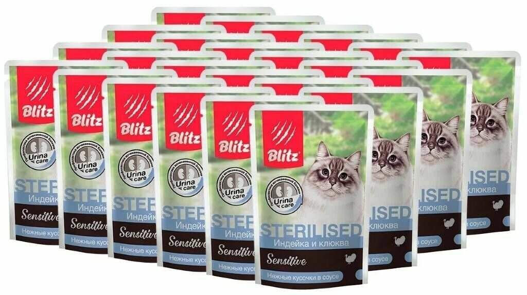Blitz Sensitive Sterilised Cats влажный корм для стерилизованных кошек, с индейкой и клюквой, в паучах - 85 г x 24 шт