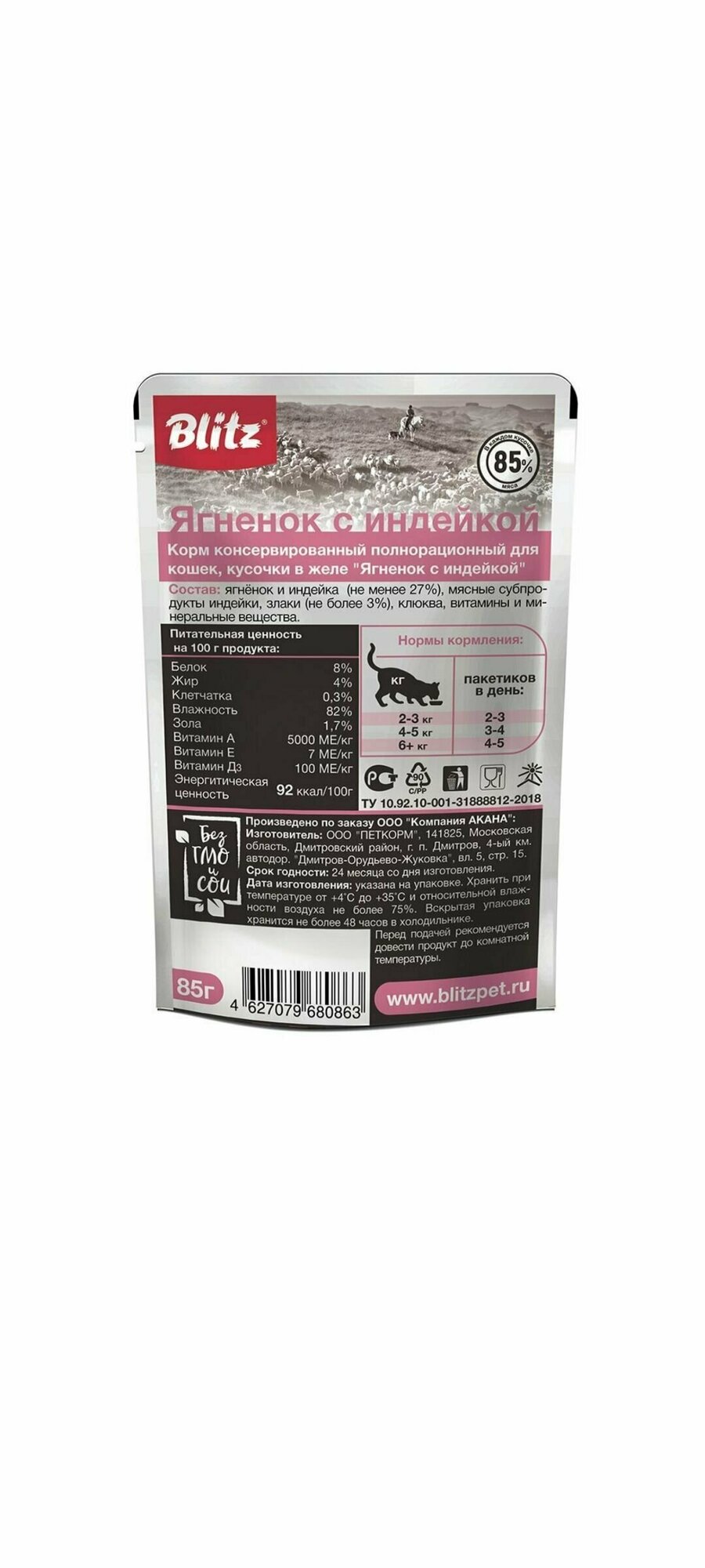 BLITZ Консервы д/кошек Ягненок с Индейкой в желе пауч 85гр 12шт